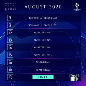 La UEFA Champions League 2019/20 sí se reanudará, arrancará en agosto, formato a partido único a partir de Cuartos de Final (misma sede) y nos dejará 11 partidos en un lapso de 16 días. A GOZAR. pic.twitter.com/JHukNyCIbC