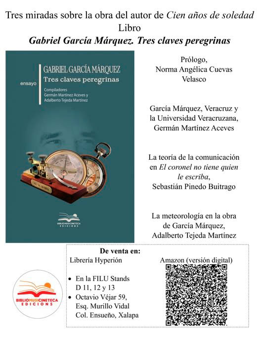 En el stand de Hyperión,en la FILU, está a la venta “Gabriel García Márquez. Tres claves peregrinas”, un libro de Bibliomusicineteca Ediciones, de Barcelona, España, compilado por Germán Martínez Aceves y Adalberto Tejeda Martínez con textos de Sebastián Pineda Buitrago y Norma Angélica Cuevas Velasco.