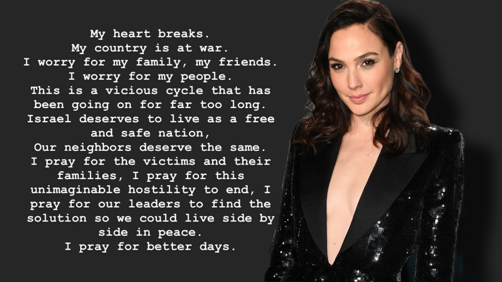 “Mi corazón se rompe. Mi país está en guerra”, publicó Gadot en un comunicado en Twitter el miércoles.