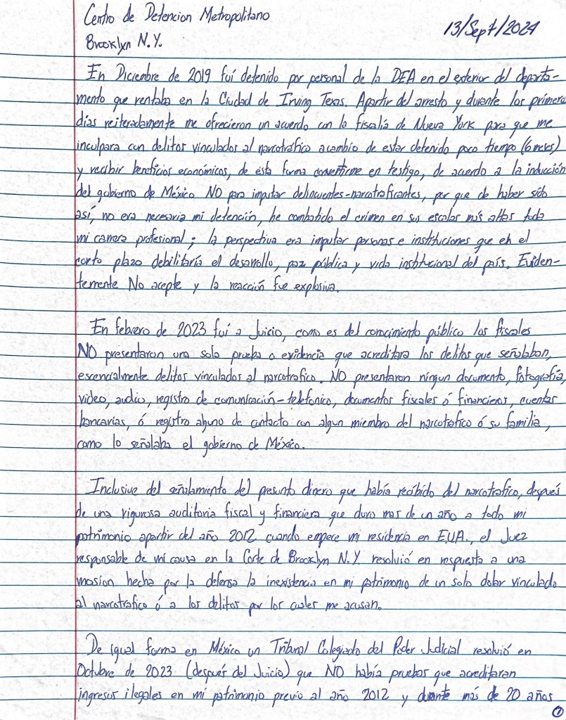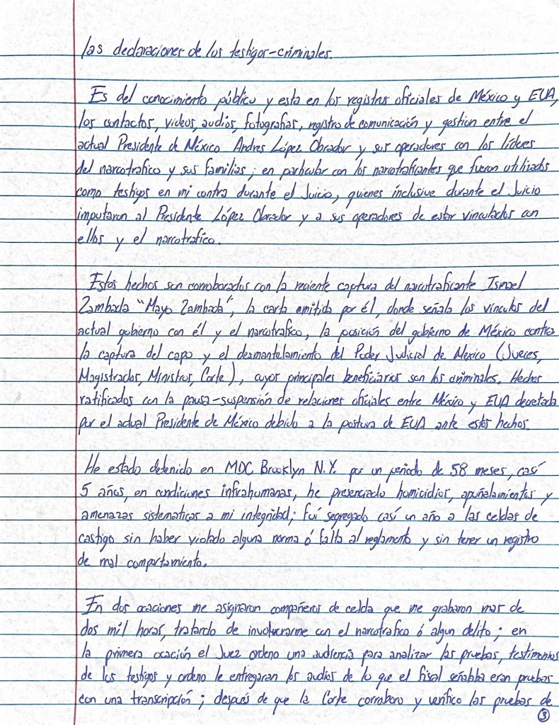 El ex funcionario también se queja de haber sido colocado en celdas de castigo y de ser grabado constantemente por otros internos con el fin de involucrarlo en actividades del narcotráfico. Asimismo, reitera que en su juicio no se presentaron pruebas contundentes como fotografías, videos o documentos que acreditaran los cargos en su contra.