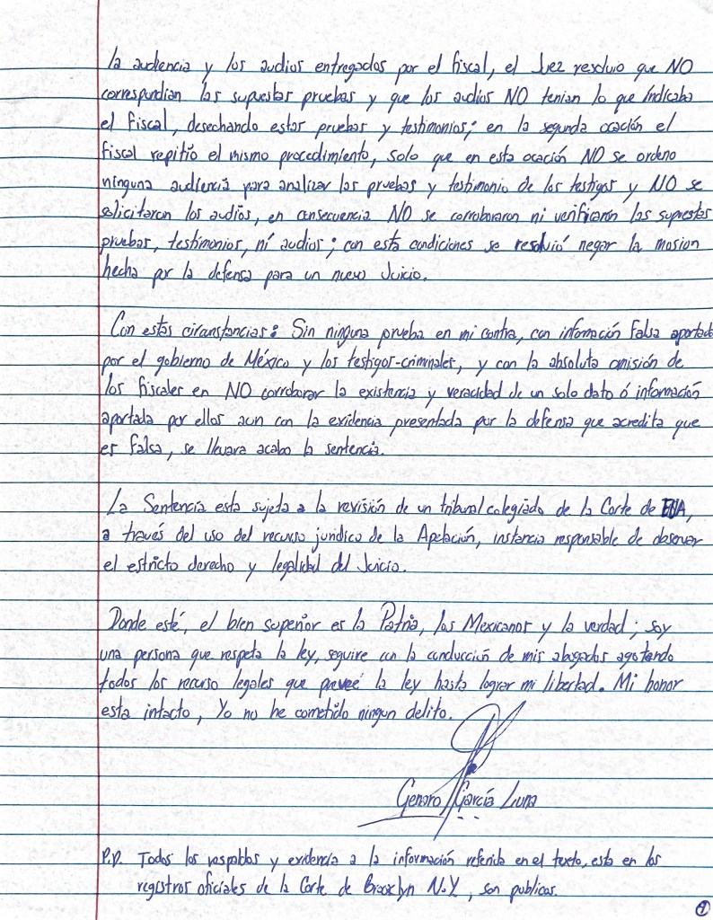 García Luna, quien fue declarado culpable de recibir sobornos del narcotráfico y colaborar con el Cártel de Sinaloa, defiende su inocencia y sugiere que ha sido víctima de un «complot» orquestado por AMLO y otros actores del gobierno. En la carta, también menciona que le ofrecieron un trato para inculparse, lo que habría reducido su condena a seis meses a cambio de beneficios económicos y ser testigo protegido, algo que él asegura haber rechazado.