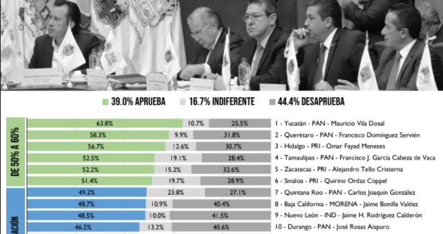 Así, Mauricio Vidal Dosal de Yucatán (PAN) obtuvo el 63.8 por ciento de aprobación y el 25.5 por ciento de desaprobación.