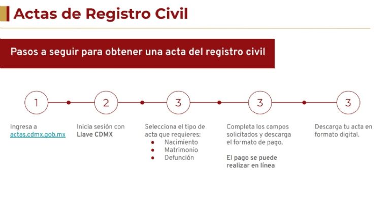 Además, a partir de este miércoles se podrán hacer solicitudes de copias certificadas de actas de nacimiento, matrimonio y defunción de manera digital en el nuevo sitio: actas.cdmx.gob.mx, sin la necesidad de acudir a los módulos de registro civil de manera presencial.