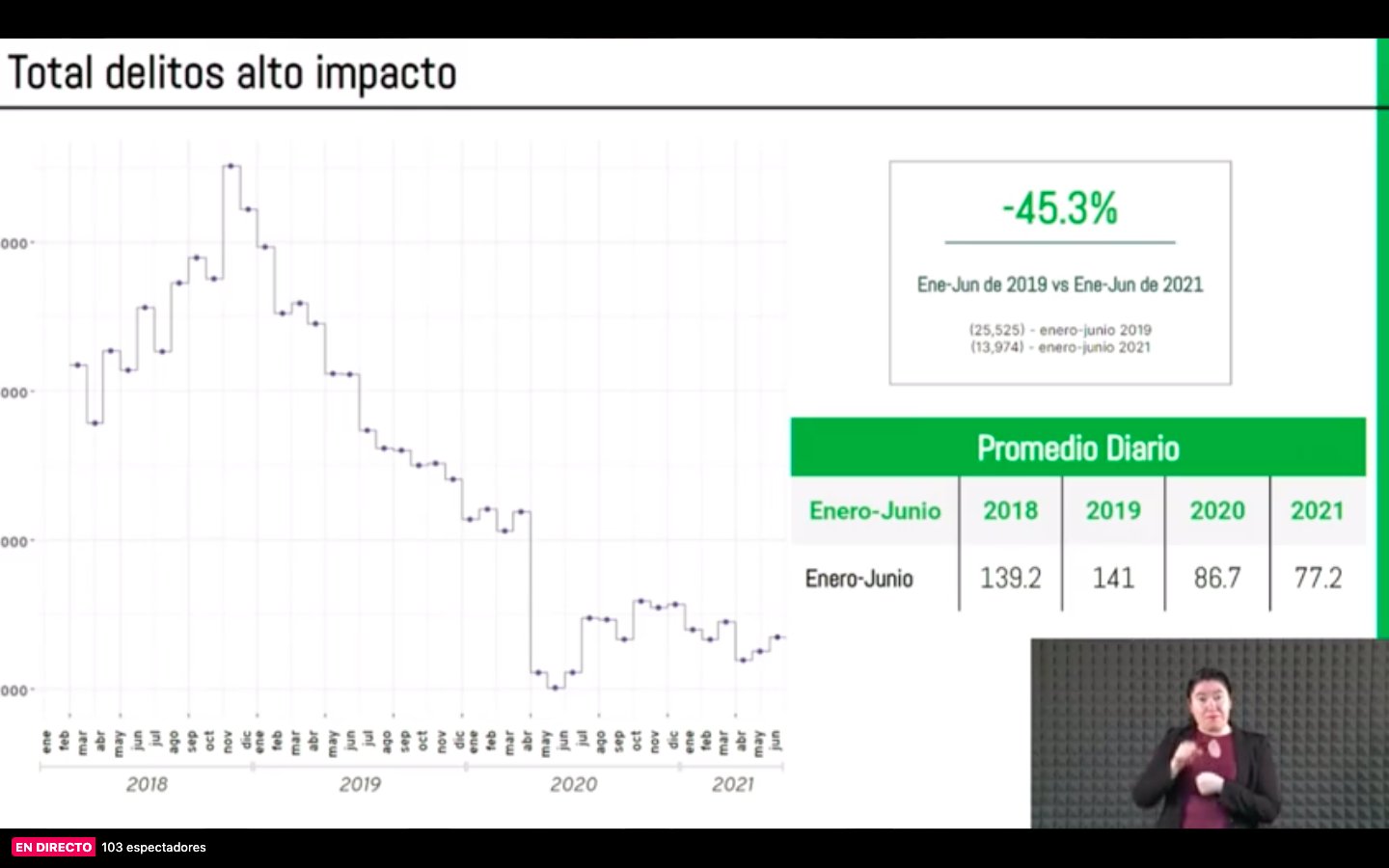 De 2019 a 2021 los delitos de alto impacto se han reducido un 45%, casi a la mitad.