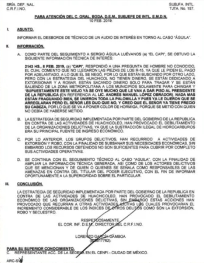 Más revelaciones de #SedenaLeaks: Amenazan de muerte “huachicoleros” a AMLO