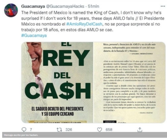 “El Presidente México es nombrado el #AmloReyDelCash, no sé porque sorprende si no trabajó por 18 años, en estos días AMLO se cae”, escribió “Guacamaya”, adjuntando fotos del libro ‘AMLO rey del cash’, escrito por Elena Chávez, quien sacó a la luz presuntos actos de traiciones políticas, abusos y corrupción ligadas al mandatario.