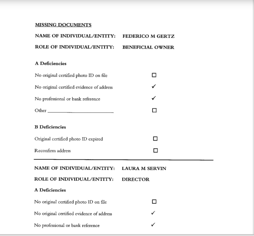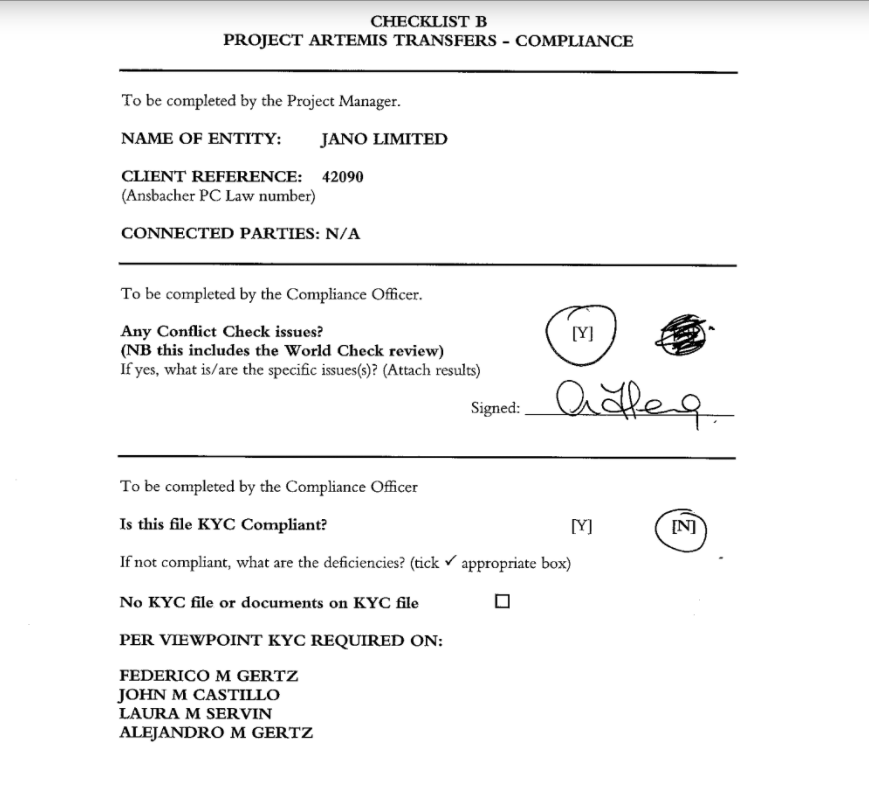 La empresa Jano Limited tenía 4 representantes, Federico M Gertz, quien aparece como propietario y beneficiario; otros tres nombres de integrantes son los de John M Castillo, Laura M Servin, quien fungía como directora, y… Alejandro M Gertz. La fuente la puede encontrar en este enlace: https://www.documentcloud.org/documents/4157241-Checklist-Jano-Ltd-Gertz-Manero.html. Pero si usted está leyendo este artículo en su versión impresa, no se moleste, aquí le mostramos la impresión de los documentos: