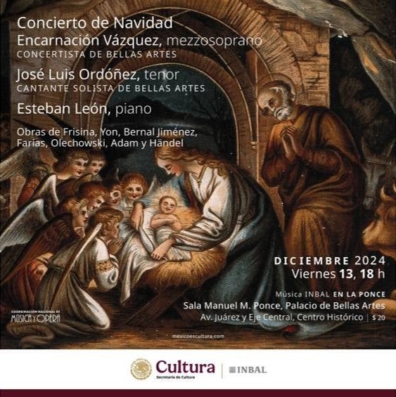 Este viernes 13 de diciembre, a las 18:00 horas, la Coordinación Nacional de Música y Ópera del Instituto Nacional de Bellas Artes (INBAL) realizará un concierto navideño en la Sala Manuel M. Ponce del Palacio de Bellas Artes, en donde se cantarán los villancicos más destacados de todos los tiempos.