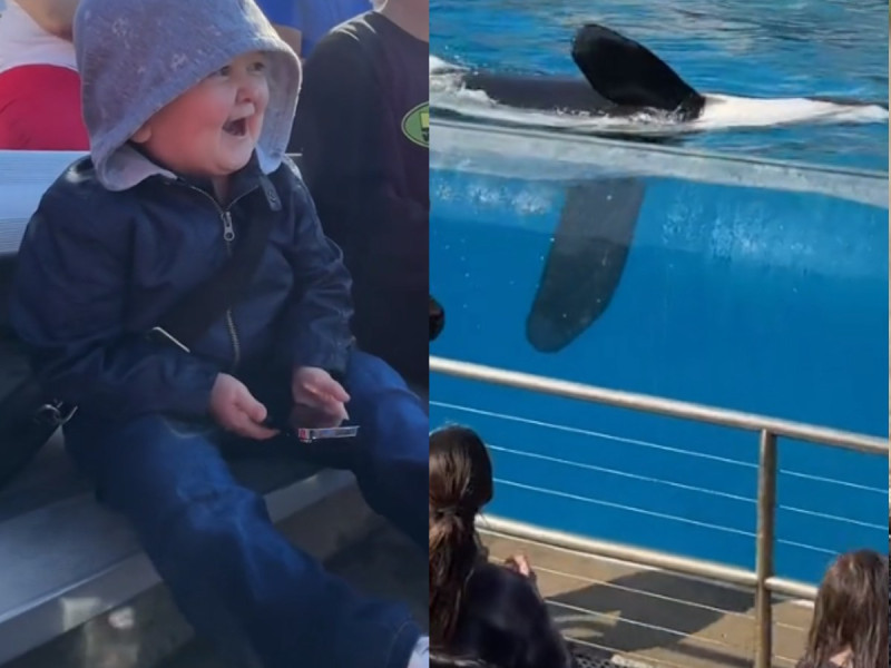 La orca movía su caudal para mojar a quienes veían en el espectáculo y Hasbulla reía sin control mientras grababa con su celular. Incluso, su reacción captada en video fue contagiosa.