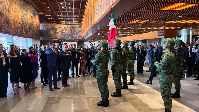 Por su parte, la entonación del Himno Nacional Mexicano con la Banda de Música en el Salón de Plenos, pues por la naturaleza de sus funciones, sus integrantes no portan armas.