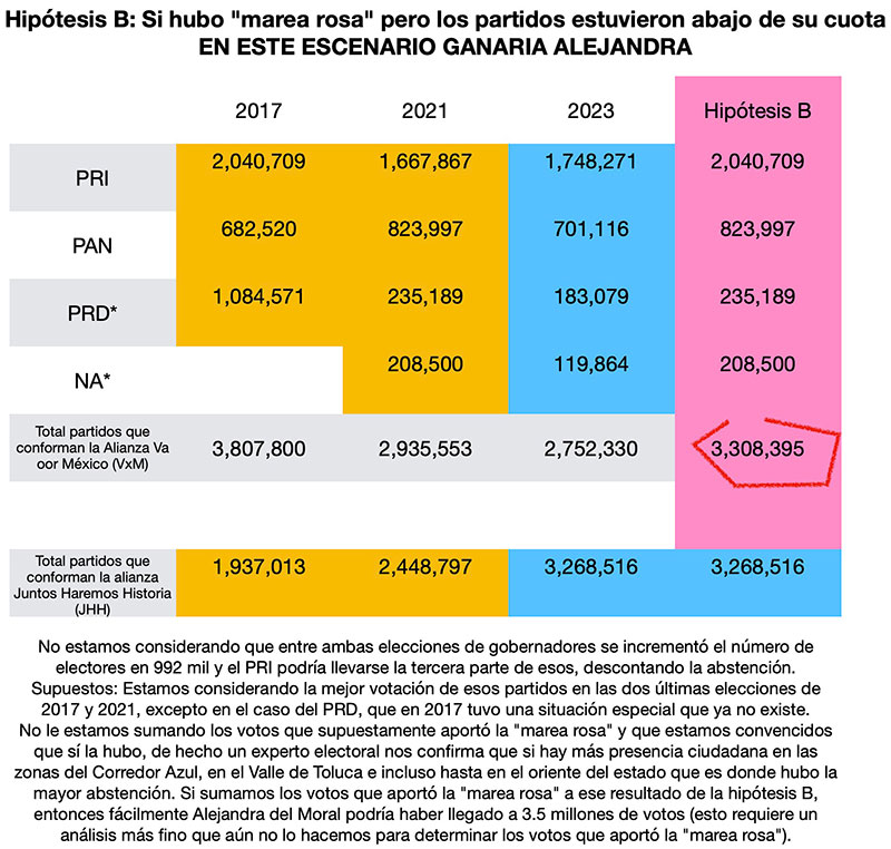 Es decir si los partidos hubieran hecho su mejor esfuerzo, más los votos de la “marea rosa” que sí hubo, pero aún no la hemos calculado en cuánto, ya con eso es suficiente para que Alejandra del Moral hubiese ganado la elección.
