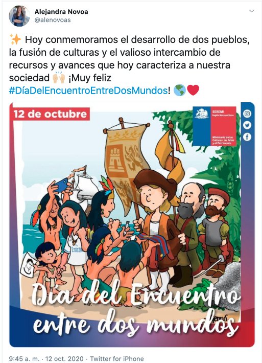 El mensaje resultó particularmente indignante en un clima mundial anticolonialista. Además, y aún más grave, la publicación y la imagen satírica coinciden también con manifestaciones sociales en casi todo el continente. Particularmente en Chile se llevó a cabo la “Marcha por la resistencia mapuche”, nación que ha resistido saqueos y criminalización desde que el hoy territorio chileno fue invadido por los españoles.