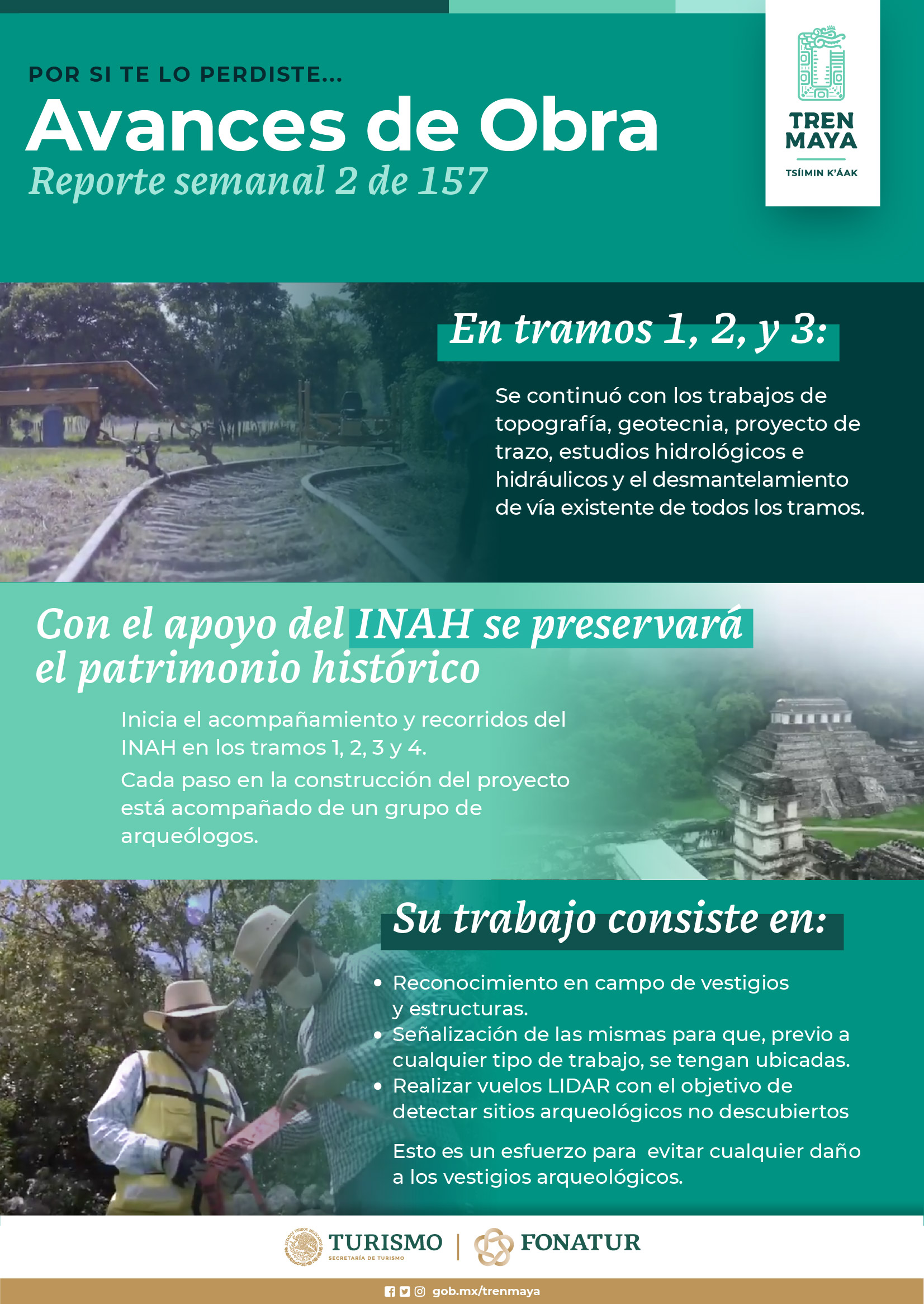 MÉRIDA.- Durante la presentación del segundo reporte semanal de los avances del Tren Maya se informó sobre el trabajo del Instituto Nacional de Antropología e Historia (INAH) para localizar sitios arqueológicos no descubiertos.