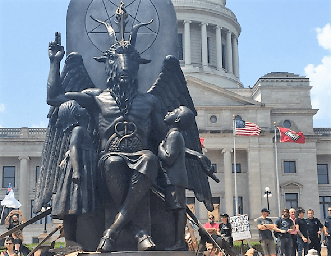 El pasado jueves 16 de agosto, miembros de un culto satanista colocaron frente al Capitolio una estatua de bronce de Baphomet, personaje representado con una cabeza de cabra y que aparece junto a las efigies de dos niños sonrientes.