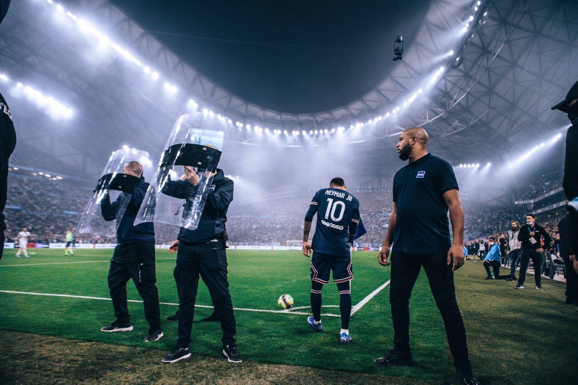 Uno de los jugadores del PSG resultó ser afectado por uno de los proyectiles arrojados en dirección a un poste de esquina, siendo Neymar Jr, quien se encontraba a punto de golpear el balón, así mismo, uno de las tantas fotos compartidas en redes sociales, se observa al astro brasileño ser protegido por miembros de seguridad, quienes al tiempo se cubrían de los objetos que arrojaba la afición.