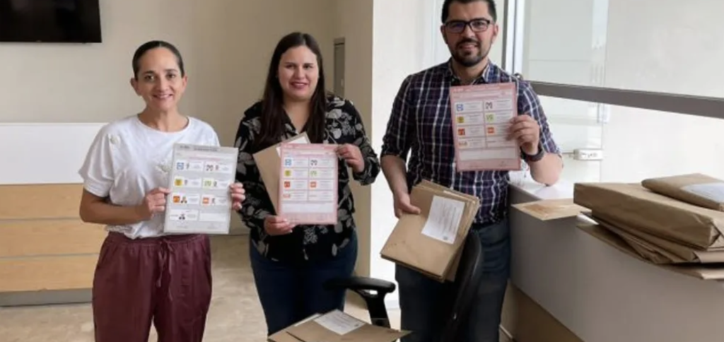 La señora que también usa cubrebocas, saca de su bolsa una lona con la foto del candidato del PT, Ricardo Mejía.