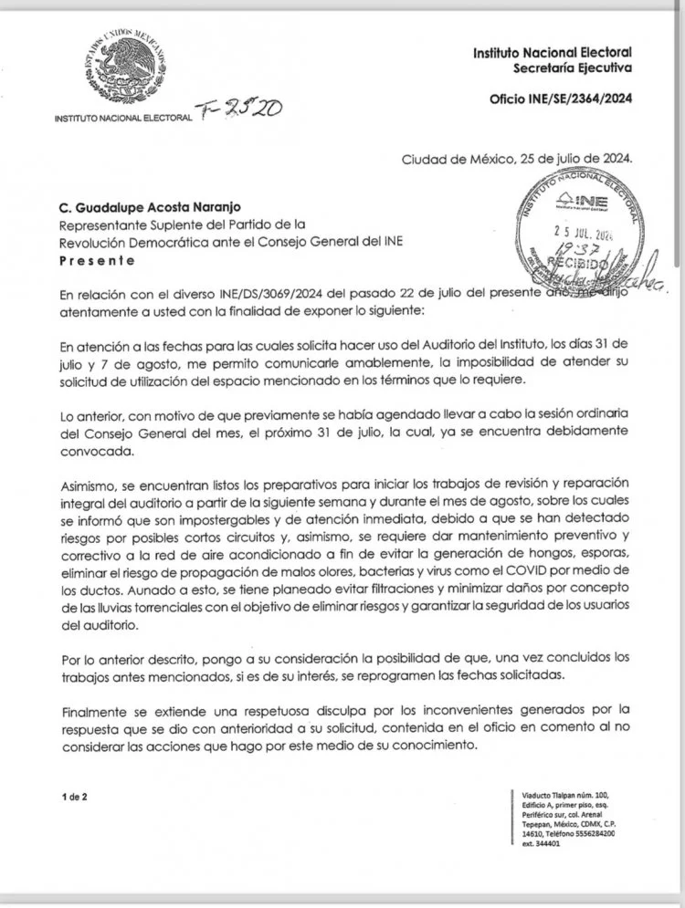 El Instituto Nacional Electoral (INE) ha informado al Frente Cívico Nacional (FCN) que no podrá utilizar su auditorio para dos foros programados debido a reparaciones urgentes que iniciarán la próxima semana.