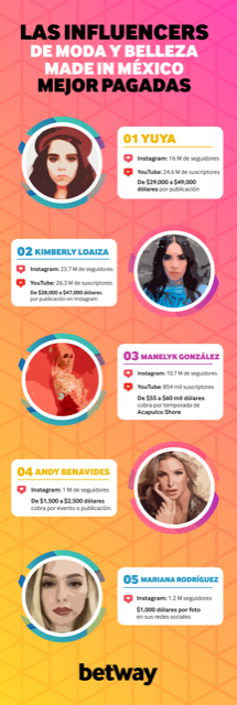 Bloguera desde la adolescencia, originaria de Cuernavaca, apasionada por las marcas, la moda, el maquillaje y los accesorios, Yuya es quizás la pionera de los emprendimientos en las redes sociales de México más trascendental, pues con una marcada personalidad energizante, carismática y atrapante, se ha ganado el amor de sus followers. Con unos 16 millones de seguimientos en IG y 24,6 millones de suscriptores en YouTube, el éxito de esta mexicana habla por sí solo. Se pudo conocer que puede cobrar más de $45 mil por post sobre una marca.