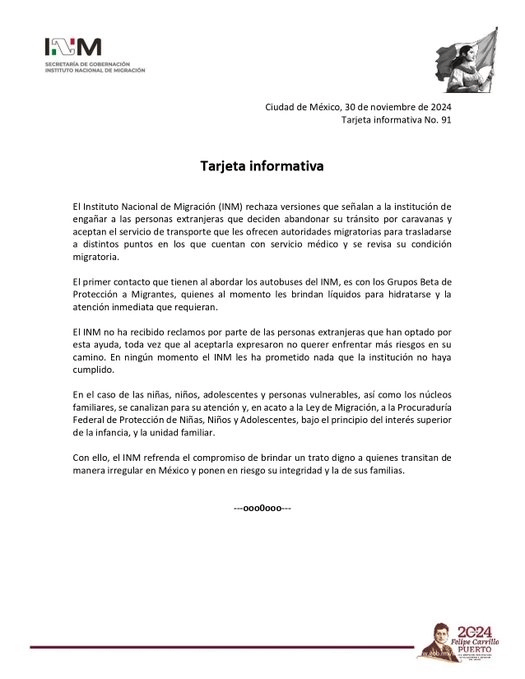 El INM también subrayó que en ningún momento se han hecho promesas que no se hayan cumplido. En situaciones donde hay niñas, niños, adolescentes o personas vulnerables, se les canaliza para recibir la atención adecuada, siempre bajo el principio del interés superior de la infancia y priorizando la unidad familiar.
