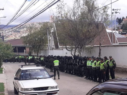 El asedio de la policía boliviana ha vuelto, desde el pasado 28 de diciembre en que habría entrado en un período de tregua, hasta hoy. Simultáneamente, decenas de manifestantes demandando la liberación de los exfuncionarios bolivianos refugiados al interior de a sede diplomática mexicana.
