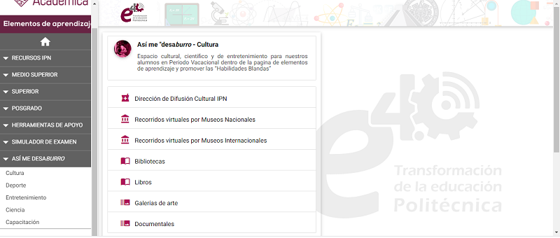 CIUDAD DE MÉXICO.- Para contribuir a que alumnos, docentes y personal de apoyo y asistencia a la educación tengan la oportunidad de consultar múltiples temas de esparcimiento y culturales, durante este periodo de emergencia sanitaria y distanciamiento social por el COVID-19, el Instituto Politécnico Nacional creó la sección Así me Desaburro dentro de la página web elementosdeaprendizaje.ipn.mx/