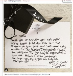 A principios de esta semana, la joyería neoyorquina publicó una fotografía del pedido -en una caja- de la hija de Trump, junto con una nota personalizada dejada por sus propietarios, donde le informaban que las ganancias por su compra serían donadas al Consejo Americano de Inmigración, Everytown for Gun Safety -un grupo a favor del control de armas-, y la campaña de Hillary Clinton. El título del mensaje lee, “Estimada @ivankatrump, #thanksbutnothanks #payitFORWARD”.
