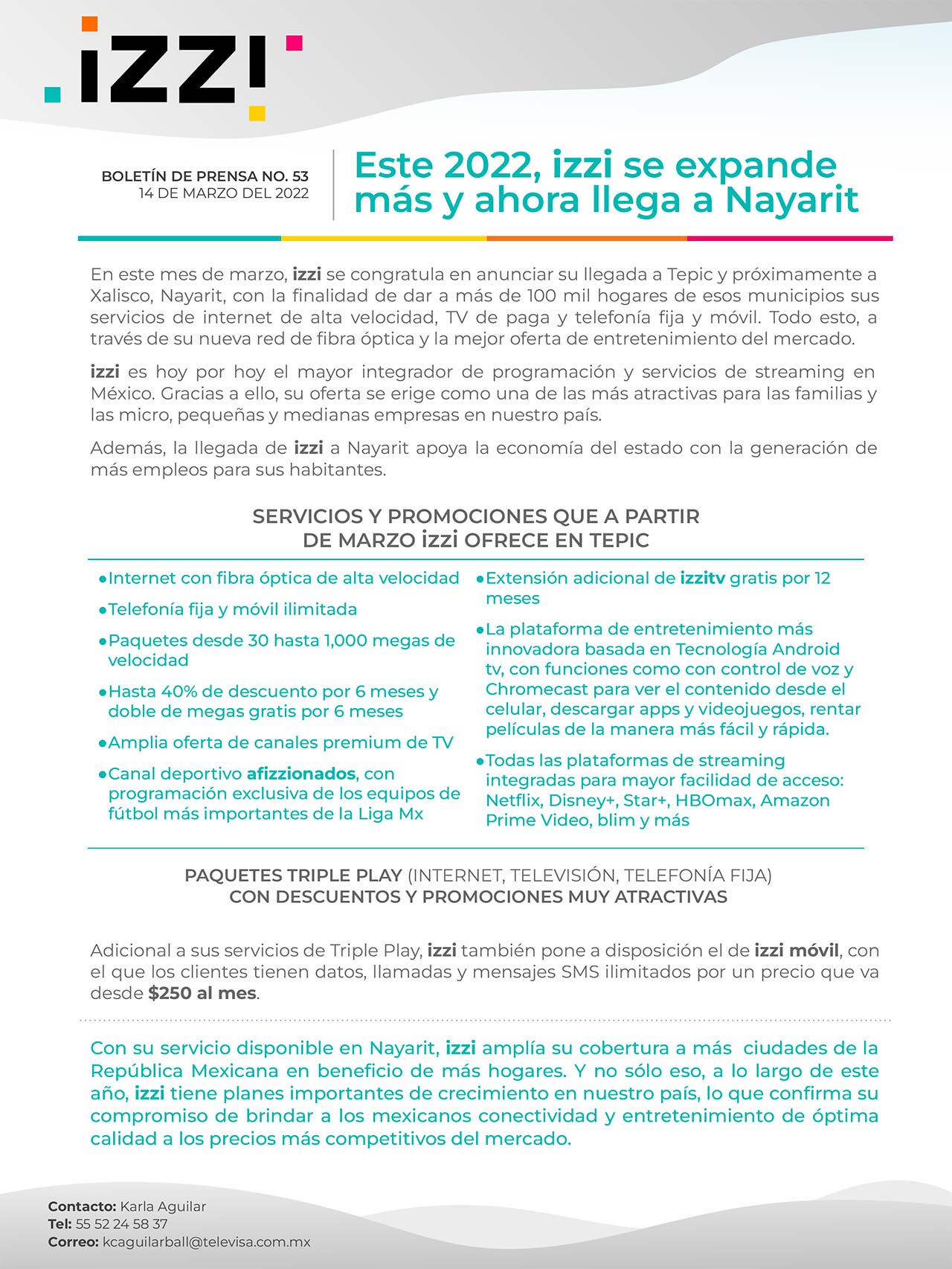 Con un mercado de al menos 100 mil hogares, izzi anunció su llegada a Tepic y próximamente a Xalisco, ambas en Nayarit, donde ofrecerá los mejores servicios de internet de alta velocidad, TV de paga y telefonía fija y móvil.