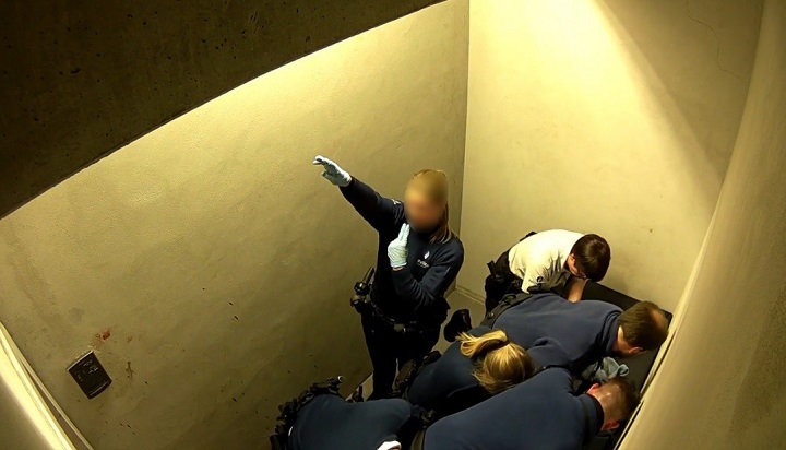 Acto seguido la policía interviene para controlar al sujeto y esposarlo. Durante esta acción uno de los funcionarios de la policía federal (intervienen seis en total) se sienta sobre el hombre, que se encuentra tendido boca abajo sobre un colchón, durante 16 minutos.