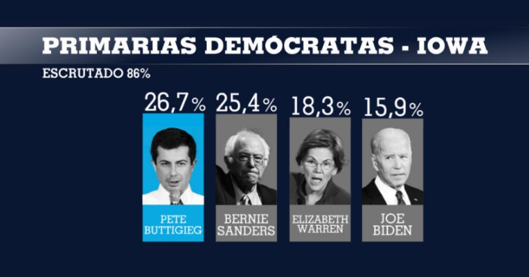 Pete Buttigieg, quien sería el primer presidente abiertamente gay en la historia de Estados Unidos, aventajó por menos de un punto porcentual al senador Bernie Sanders. Dejando hasta en un cuarto puesto rezagado, al exvicepresidente Biden, con el 15.9 %.