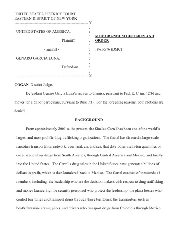 “El Cartel (de Sinaloa) ha dirigido una red de transporte de narcóticos a gran escala, por tierra, aire y mar, que distribuye varias toneladas de cocaína y otras drogas desde América del Sur, a través de América Central y México, y finalmente a los Estados Unidos”, se pudo leer en el documento.