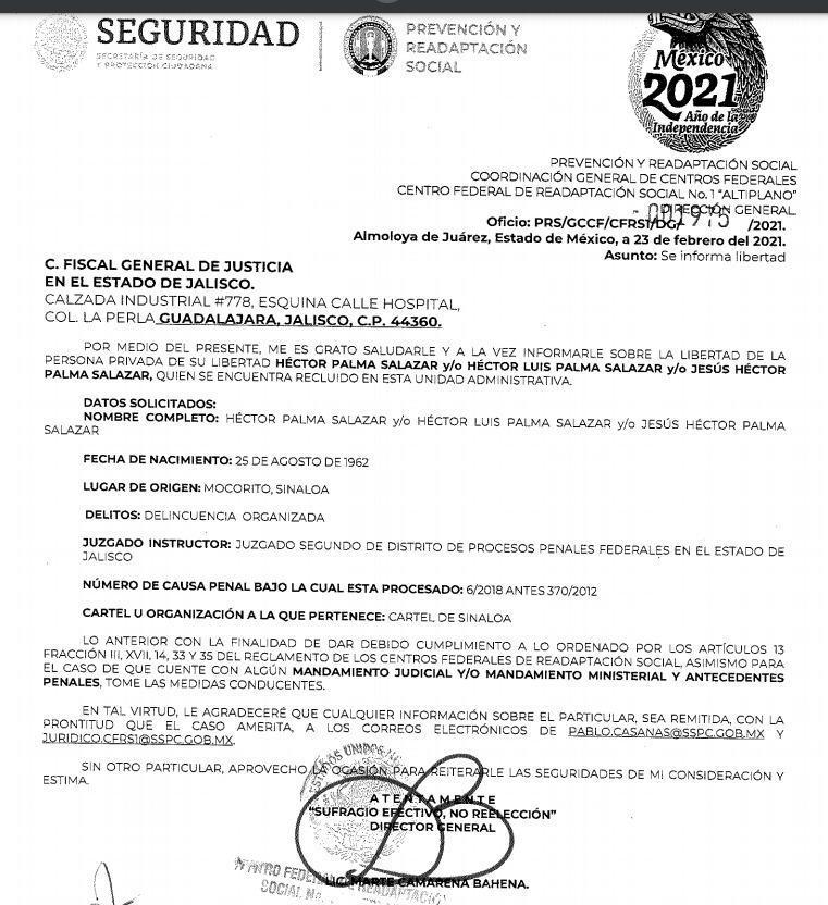 De acuerdo con un documento firmado por Marte Camarena Bahena, director del penal El Altiplano, fue el Juez Segundo de Distrito de Procesos Panales Federales en el estado de Jalisco quien ordenó la libertad de Palma Salazar.