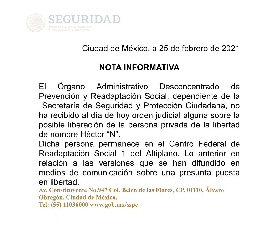 Hasta el momento las autoridades penitenciarias federales no han emitido ningún comunicado oficial sobre la posible libertad de El Güero Palma, quien se encuentra recluido en México desde junio de 2015 una vez que fue deportado de Estados Unidos.