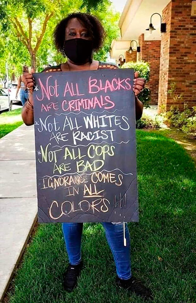 Una mujer de color recorre las calles de su colonia con un letrero que dice… “no todos los negros son criminales, no todos los blancos son racistas, no todos los policías son malos,”… pero “la ignorancia viene en todos los colores”