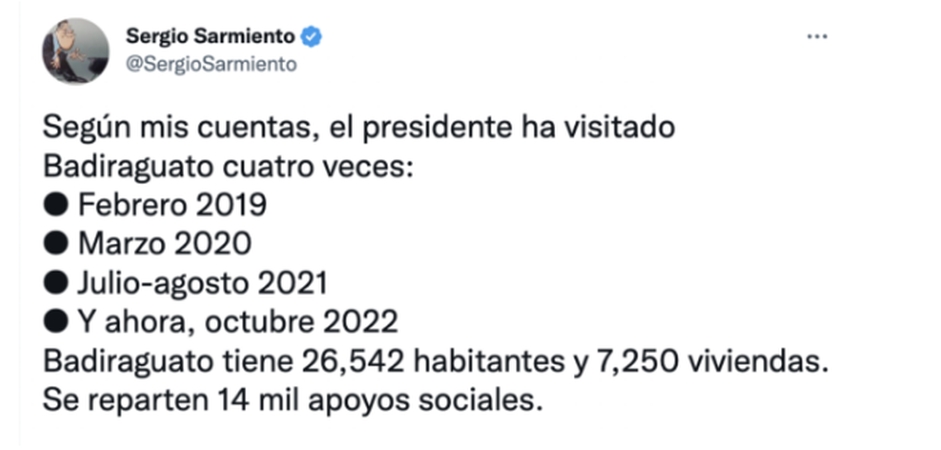 El lunes pasado, el mandatario criticó que el periodista Sergio Sarmiento lanzara especulaciones, luego que éste publicó que AMLO ha visitado en cuatro ocasiones la localidad de donde es originario el líder del Cártel de Sinaloa.