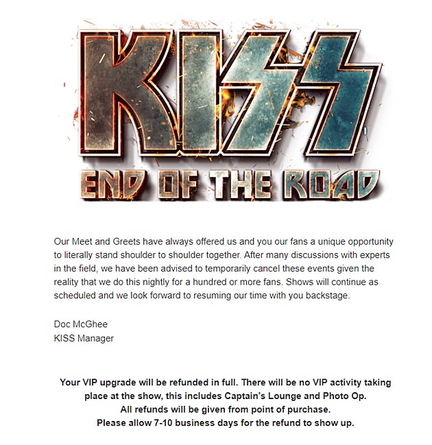 Al contrario de otros artistas, como Pearl Jam o Madonna que han tenido que cancelar sus conciertos en Estados Unidos y Europa, KISS continuará con su gira de despedida.