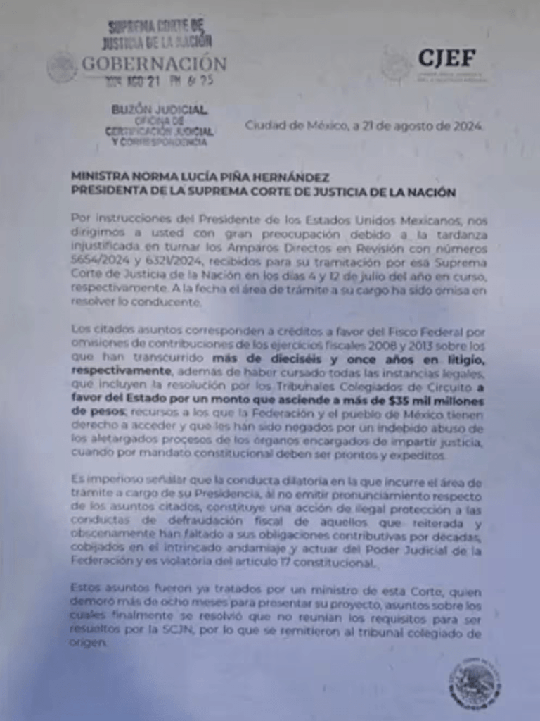 El presidente de México, Andrés Manuel López Obrador (AMLO), emitió una carta dirigida a Norma Lucía Piña Hernández, ministra presidenta de la Suprema Corte de Justicia de la Nación (SCJN), exigiendo celeridad en la resolución de dos casos fiscales que involucran un total de 35 mil millones de pesos a favor del Fisco federal.