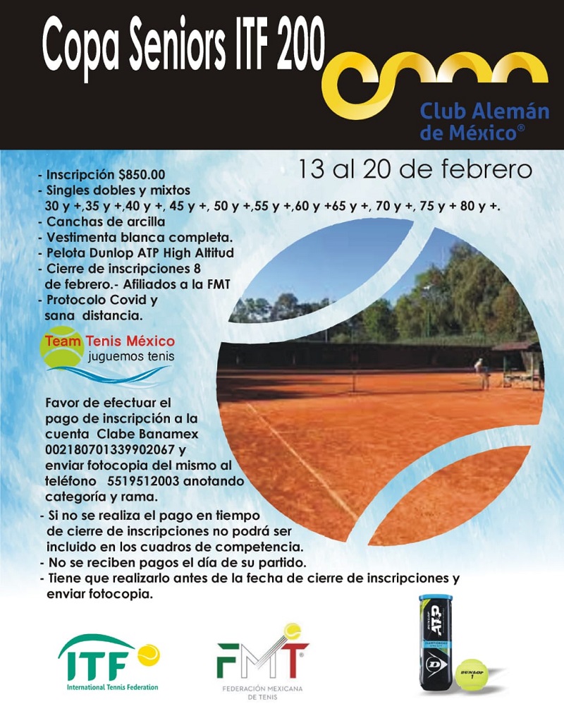 Uno de estos certámenes se llevará a cabo del 13 al 20 de febrero en el Club Alemán de la Ciudad de México, será la Copa Senior ITF 200.