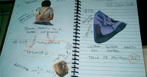 “En México hay más de 35.000 desapariciones y nadie sabe cuántas fueron cometidas por las autoridades; desde 2016 el grupo visita regularmente la morgue para recabar datos de los cuerpos que no son reclamados; se fijan en rasgos que pueden ayudar a identificarlos: tatuajes, lunares, la forma y desgaste de los dientes, su ropa, zapatos y los anotan en libretas escolares.