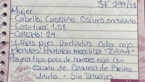 Después, en letra torpe o cuidada, menuda o grande, acompañada de dibujos o no: “Mujer. Cabello castaño oscuro ondulado. Estatura: 1.58. Uñas pies pintadas color rojo. Prendas: pantalón mezclilla ‘Zara’. Playera tipo polo de hombre roja. Sin tatuajes; Es la descripción de un cuerpo localizado el pasado 28 de agosto dentro de una fosa clandestina. El cadáver está en el Servicio Médico Forense de Jalisco, en el occidente de México. No ha sido identificado”.