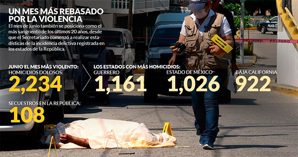“Cada 21 minutos con 7 segundos se inició una carpeta de investigación por homicidio doloso a nivel nacional durante agosto de este año, según el “Reporte sobre delitos de alto impacto. Agosto 2017”; además, los casos denunciados de homicidio doloso, secuestro y extorsión incrementaron entre julio y agosto del presente año. En el documento se estableció que el delito de homicidio doloso pasó de 2 mil 29 carpetas de investigación abiertas en julio, a 2 mil 114 en agosto, un alza de 4.19 por ciento. En materia de secuestro, las carpetas de investigación aumentaron de 117 a 127, es decir, 8.55 por ciento más.