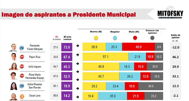 Cuestionaron y midieron la imagen de los aspirantes. A esa lista exclusiva de políticos anotaron a los siguientes: Fernando Yunes Marquez (PAN), Pepin Ruiz (Morena), Anilú Ingram Vallines (Morena), Rosa María Hernández Espejo (Morena), Indira Rosales San Roman (PAN) y Oscar Lara (MC).