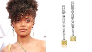 La actriz eligió aretes en oro blanco y ónix, así como 6 diamantes en corte esmeralda de 6.47 quilates, 6 diamantes en corte pera de 2.65 quilates, 6 diamantes en corte cuadrado de 1.44 quilate y 10 diamantes redondos en pavé de 1.10 quilates.