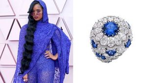 La cantante utilizó un anillo de la Colección Haute Joaillerie de Chopard, con un spinel morado en forma de cojín de 12.649 quilates, rodeado de diamantes blancos y engasado en oro blanco de 18 quilates.