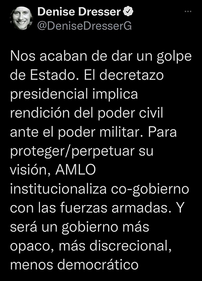 Denise hoy ataca,no veo otra cosa en sus “informaciones columneras”,a Amlo por el “decretazo” que según ella y otros “conocidos” aduladores de los criminales sexenales del “prianato”,en los pinos,ven en esto un ataque–“golpe de estado”,le llama–a la democracia……..¡POR DIOS,Denise!…¿Cual democracia,cuando ha habido esta?..Por favor ILUMINANOS, y dejanos saber cuando esto sucedio de que México,antes de Amlo,tuviese “democracia”