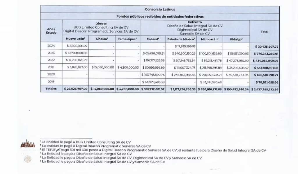Esta situación levantó sospechas de actividades de lavado de dinero y corrupción, ya que el dinero recibido desde 2021 no aparece en los presupuestos de Comunicación Social o de Publicidad de Latinus, sino en los de medicinas y productos de atención médica.