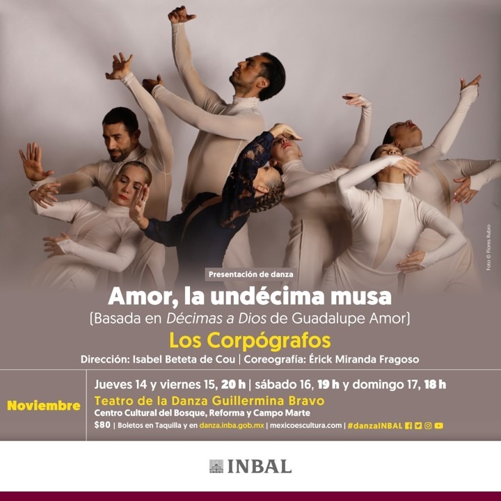 Amor, la Undécima Musa está basado en “Décimas a Dios” de Guadalupe Amor, bajo la dirección de Isabel Beteta de Cou y la coreografía de Erick Miranda Fragoso. Tendrá funciones jueves 14 y viernes 15, a las 20 horas; el sábado 16, a las 19:00 horas y el domingo 17, a las 18 horas.