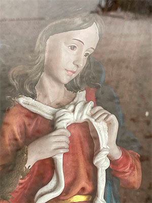 La isla de las conchitas, como le llaman los pobladores de esta región del municipio de Alvarado, tiene una imagen en bulto de la Virgen María, con túnica rosa y manto azul. Alrededor de su cuello, como si de una bufanda se tratara, el lazo de nudos, los nudos de la existencia, los problemas de la vida en los que se ha vuelto experta. Su rostro es tranquilo, hermoso, como el de una madre.