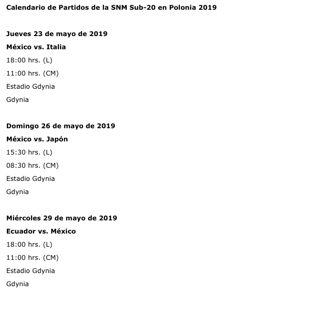 El Tri Sub-20 está ubicado en el grupo B de la Copa del Mundo, que se realizará en Polonia del 23 de mayo al 15 de junio, y se verá las caras con Italia, Ecuador y Japón.