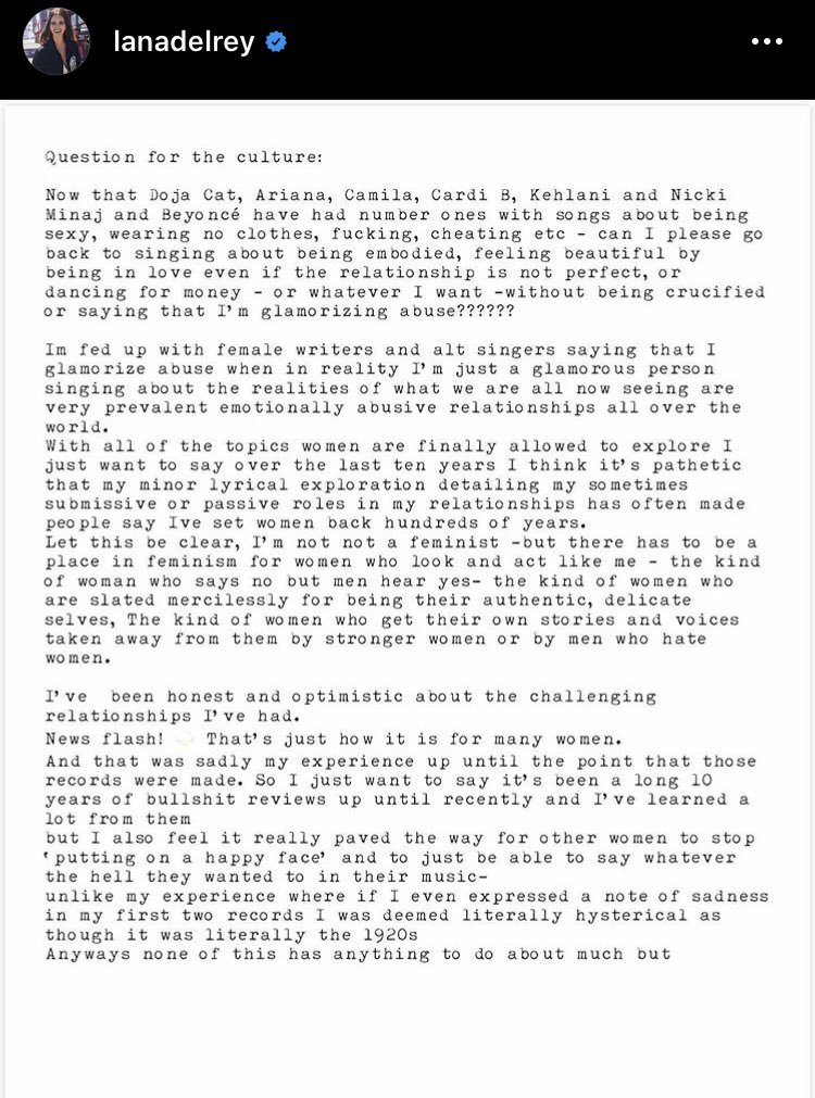 Lana mencionó que siempre ha sido honesta y optimista a la hora de hablar de las relaciones por las que ha pasado. Y que a pesar de las malas reseñas que recibieron sus primeros discos, esperaba que con esas canciones algunas mujeres dentro de la industria musical dejaran de poner una cara feliz, abrieran los ojos y hablaran de lo que ellas quisieran. Acá les dejamos el texto de Lana: