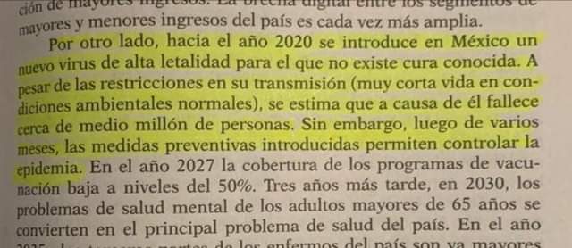 “Hacia el año 2020 se introduce en México un nuevo virus de alta letalidad para el que no existe cura conocida. A pesar de las restricciones en su transmisión (muy corta vida en condiciones ambientales normales), se estima que a causa de él fallecen cerca de medio millón de personas. Sin embargo, luego de varios meses, las medidas preventivas introducidas permiten controlar la epidemia”, reza el libro.